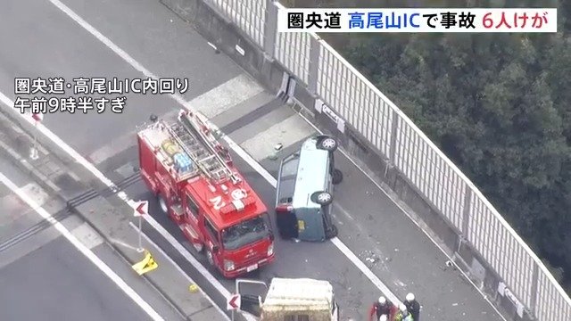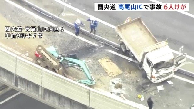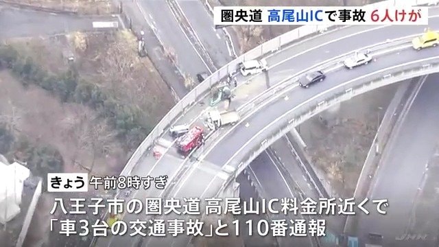 きょう午前、東京・八王子市の圏央道・高尾山インターチェンジの料金所の近くでトラックなど3台が絡む事故があり、6人がけがをしました。
