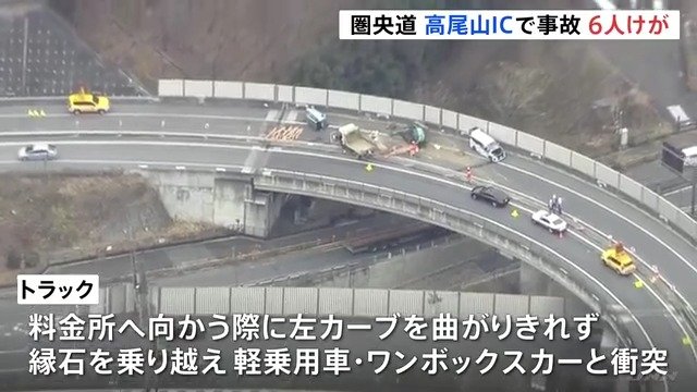 警視庁によりますと、トラックが高速道路から料金所に向かう際、左カーブを曲がりきれず縁石を乗り越え、軽乗用車とワンボックスカーにぶつかったということです。