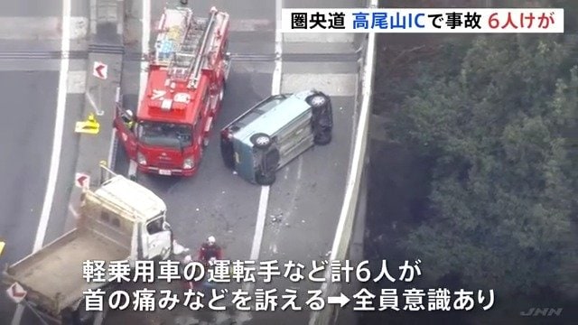 はずみで軽乗用車は横転。この事故で、軽乗用車の運転手などあわせて男女6人が首の痛みなどを訴えていますが、いずれも意識はあるということです。