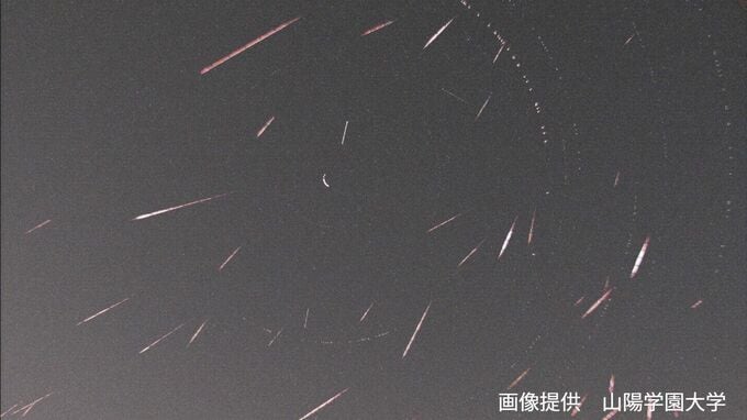 (【画像①】は、岡山市中区の山陽学園大学に設置したカメラで、3日夜から4日未明にかけて発生した流星をひとつの画面にまとめています。)