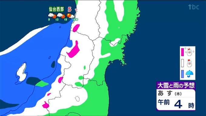 8日の朝は東部の方でも雪や雨が一時的に流れ込んでくる可能性があります。大崎平野や白石の辺りでは平地でも積もってしまうかもしれません。