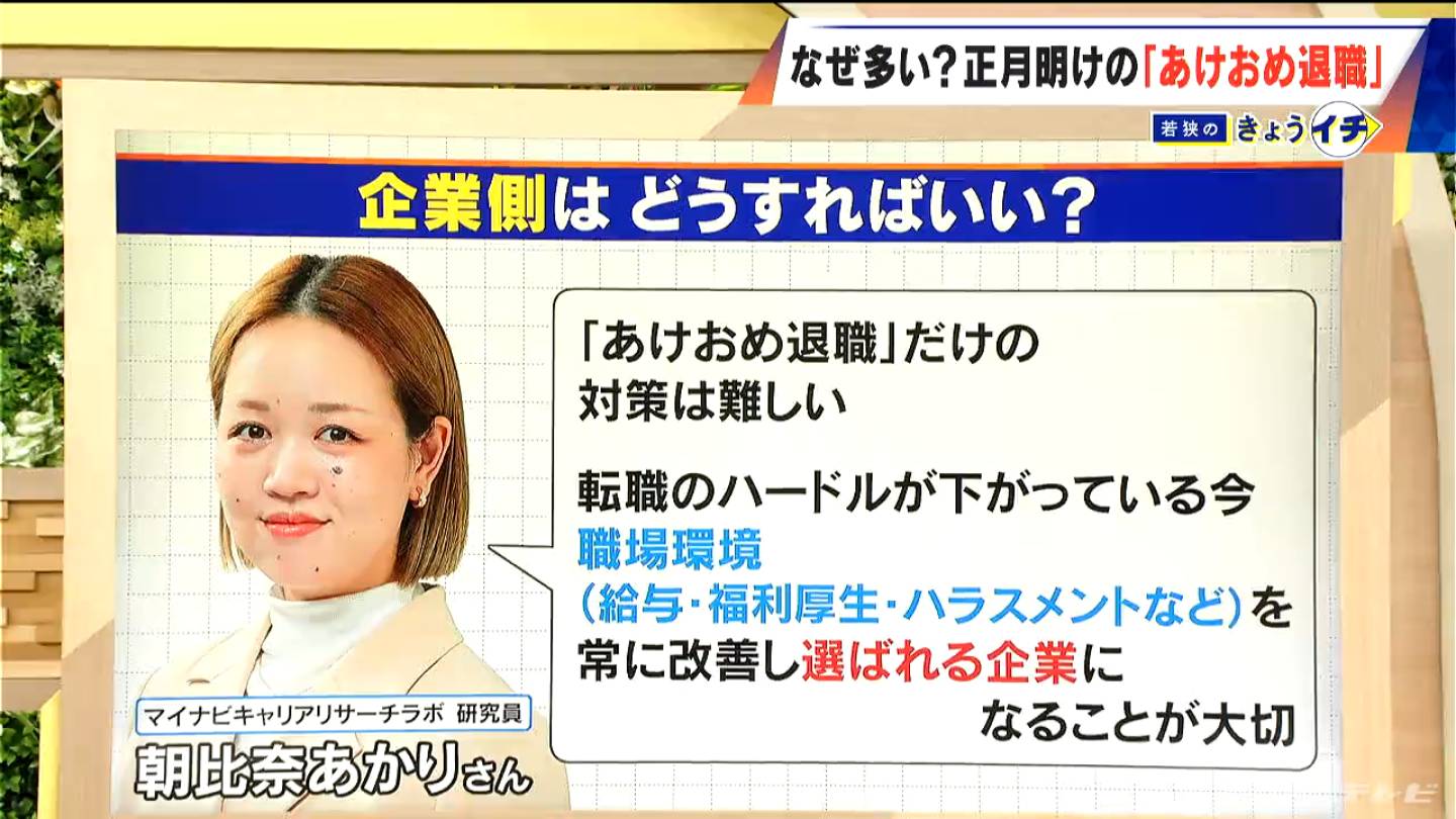 「“あけおめ退職”だけの対策は難しい。転職のハードルが下がっている今、普段から日常的に職場環境(給与、福利厚生、ハラスメント、人間関係など)を常に改善し、選ばれる企業になることが大切。と朝比奈さんは話します。