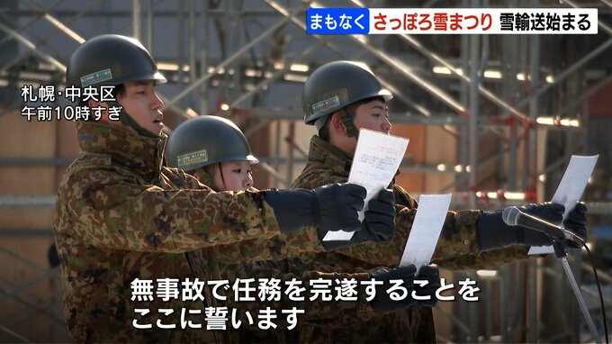 雪輸送の開始式には、雪像づくりを担当する陸上自衛隊の隊員らが参加しました。
