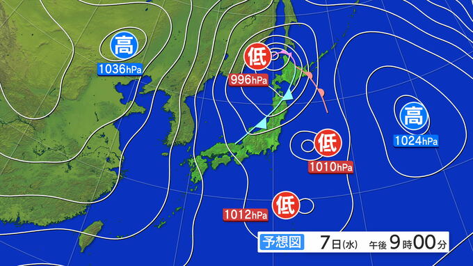 7日午後9時の予想天気図です。日中は日本海の北部を低気圧が北東よりに進みますが、急速に発達する見込みです。