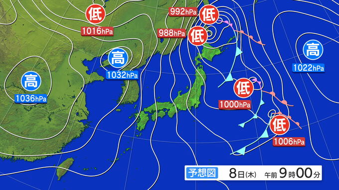 そして、8日午前9時の予想天気図ですが、低気圧は北海道の北へと進み、冬型の気圧配置になりそうです。