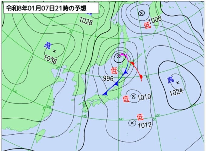 8日夜には非常に強い寒気を伴うトラフが北日本を通過し、一時的に冬型の気圧配置が強まります。北日本と北陸地方では8日は暴風雪、高波に警戒し、大雪による交通障害、着雪、なだれにも注意が必要です。