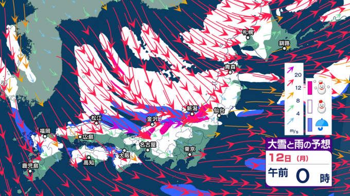 最新の「大雪・雨・風の予想シミュレーション」をみてみても、12日は日本海側を中心に、近畿・四国・九州までにも広い範囲が真っ白な“雪の影”に覆われています。また、“ドカ雪”の可能性も…。東北のほか中部地方などには大雪を示すピンク色の“雪の影”もかかる時間帯があるのがみてとれます。このほか、強い風も予想されているため、今後も最新の気象情報には留意する必要があります。
