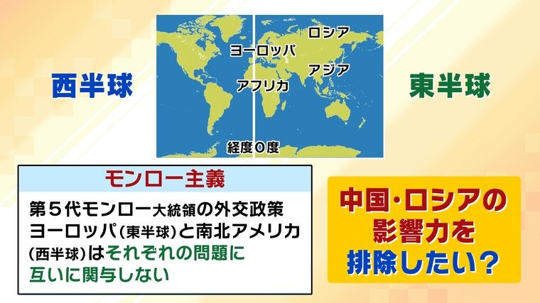 そして、今新たにトランプ大統領が打ち出している外交戦略が“ドンロー主義”。「西半球の権益はアメリカが確保する。今や“ドンロー主義”」と発言しているのです(CNNによる)。