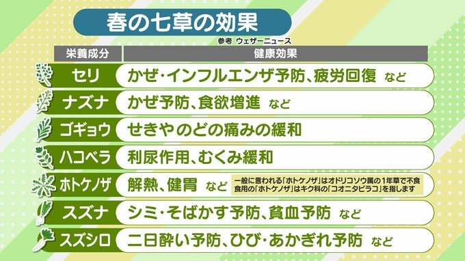 そして、セリやナズナはかぜ予防、スズシロは二日酔い予防などに効果があると言われています。