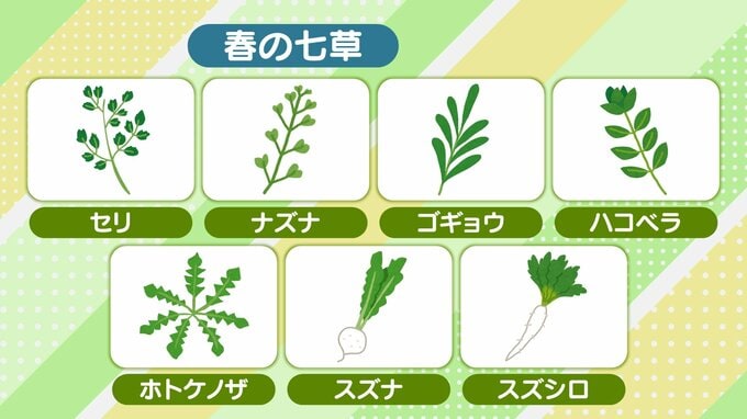 「春の七草」のスズナはカブ、スズシロはダイコンのことで、身近な食材も入っています。
