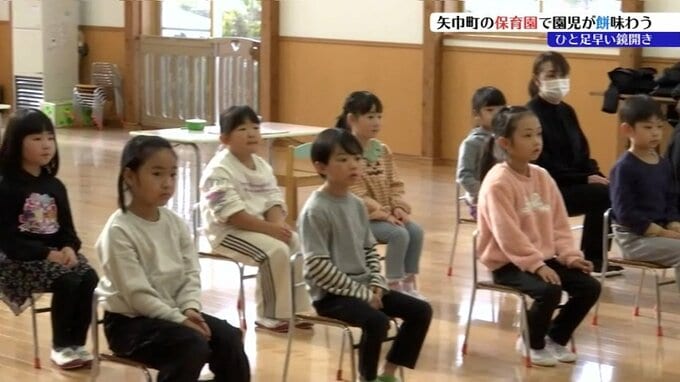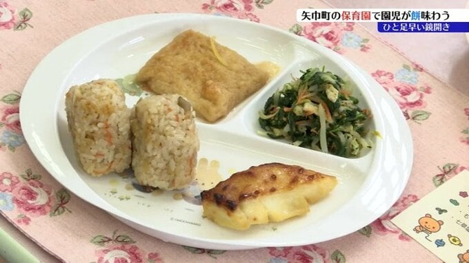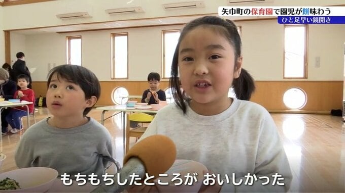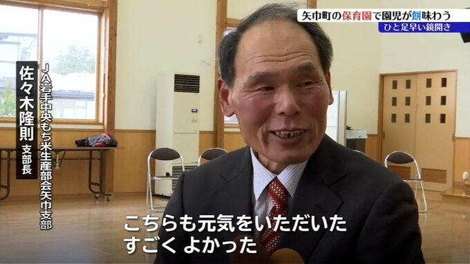 昼食会を開いたのは、全国有数のもち米の産地として知られる矢巾町の煙山保育園です。7日は生産者や町の関係者が施設を訪れ、園児たちは初めに、正月に飾った鏡餅を割って食べることで無病息災を願う「鏡開き」の意味を学びました。