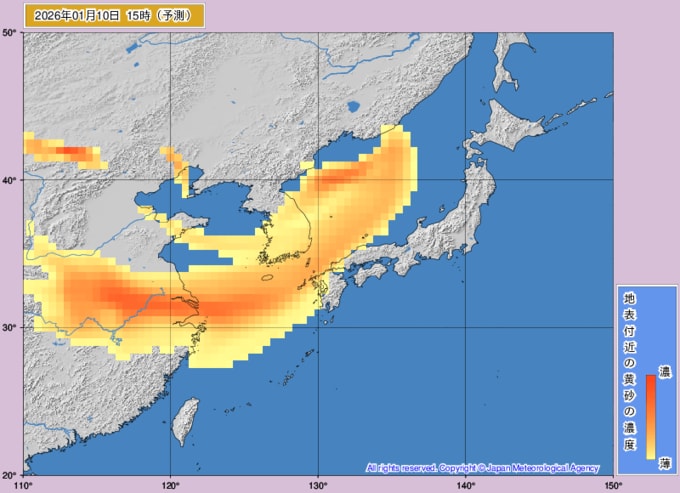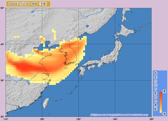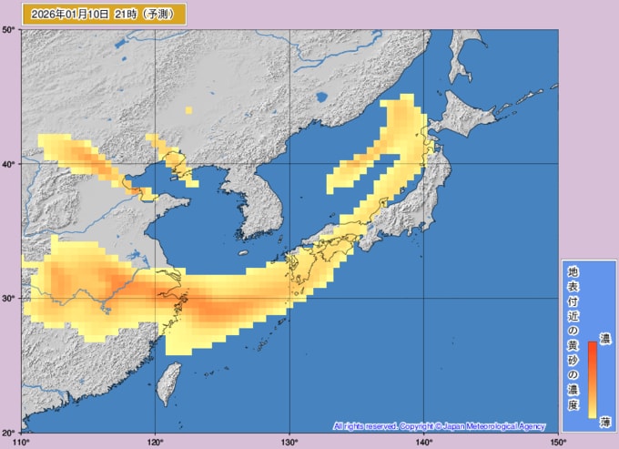 【黄砂情報】10日は日本列島の広範囲に黄砂飛来か...1月9日~1月10日の黄砂シミュレーション 黄砂を上空から見たデータで確認 気象庁発表 テレビユー山形 2026年1月7日(水) 15:16 国内 ■黄砂はいつどこに?(10日) 画像はTBS NEWS DIG Powered by JNNより