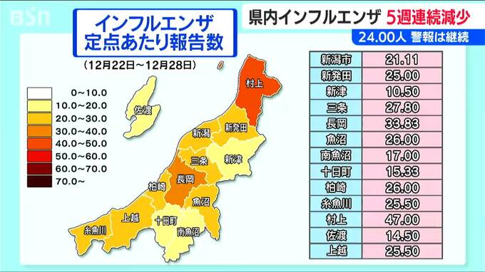 去年12月28日までの1週間に、新潟県内の医療機関から報告されたインフルエンザの感染者数は、1医療機関あたり24.00人で、前の週の33.16人から減少しました。5週連続の減少になります。新潟県は『インフルエンザの…