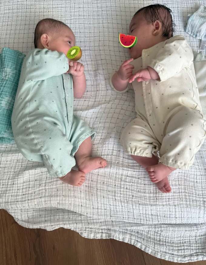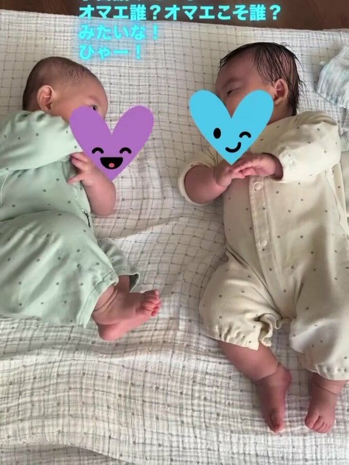 テキストでは「双子くんたち!ついにお互いを認識した??」「ふたりにしかわからない、宇宙語??ふた語?で見つめ合って」「なにか喋ってた!!目撃した!!」と大興奮の模様。絵日記にも「今日は向き合ってク~とかア~ウ~と双子語!?宇宙語!?」「2人しかわからないことばで話してた!!」と綴っています。