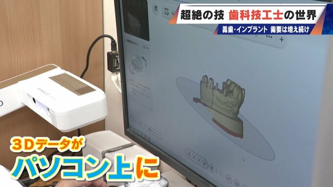 自分の工房で歯の模型をスキャン。その立体データがモニター上に浮かびます。