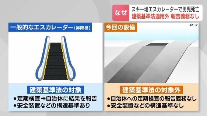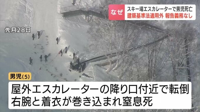 12月、北海道小樽のスキー場で5歳の男の子が屋外のエスカレーターに巻き込まれ死亡した事故で、このエスカレーターは建築基準法の適用外で市への定期検査の報告などが必要なかったことがわかりました。