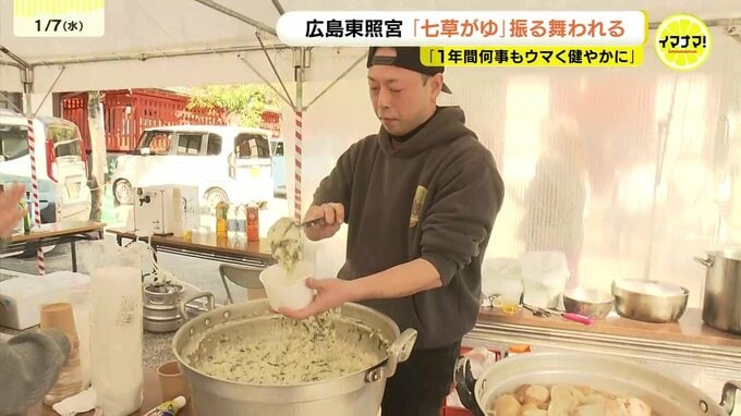 広島市東区の広島東照宮では、500食の七草がゆが販売されました。セリやナズナなど春の七草を入れたかゆを食べると、邪気が払われ、1年間、病気にならないと言われています。