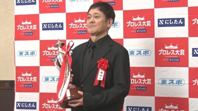 特別話題賞を受賞した有田哲平さん(くりぃむしちゅー)は、授賞式後の囲み取材で“プロレス大賞は子どもの頃から見ている。一度は何らかの形で関わりたいと思っていたら、まさか本当に(賞を)いただけるとは。あんまり芸能界の方で表彰されたこともないので、本当に嬉しい”と、喜びのコメント。