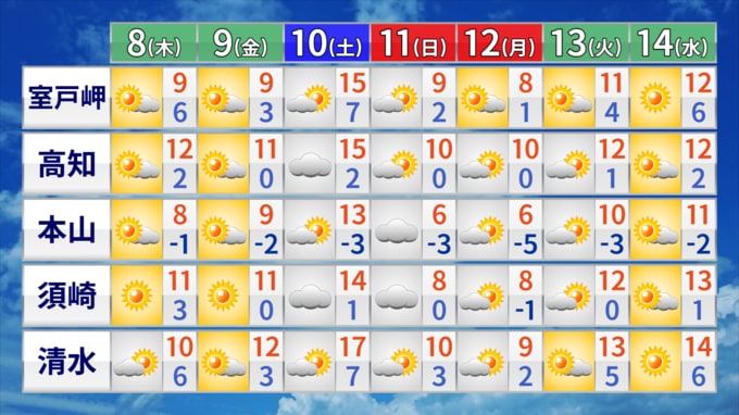 8日の高知県内は、高気圧に覆われて概ね晴れるでしょう。気温は、上空にくる寒気の影響で日中も気温が上がらずこの時期らしい寒さとなる見込みです。また、西部では北風が目立ち、風冷えの一日となるでしょう。