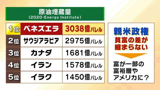 ベネズエラは第二次世界大戦、その前から石油大国として知られ、アメリカの石油資本が入って開発を進めていた。石油の埋蔵量は約3000億バレルとされる。