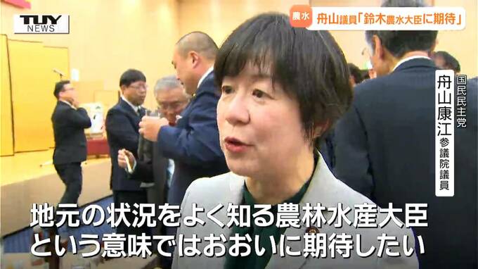 国民民主党 舟山康江 参議院議員「地元の状況をよく知っている農林水産大臣という意味ではおおいに期待したい。私たちもコメの問題、農業の問題、まさに安全保障の一環。そういう中であるべき政策、我々もいくつか提案していますがまだ細かい政策について一致ばかりではないので、これから始まる通常国会でもしっかり提案をしてできるだけ反映させられるようにがんばっていきたい」