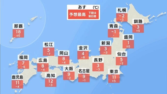鹿児島:11℃ 那覇:18℃