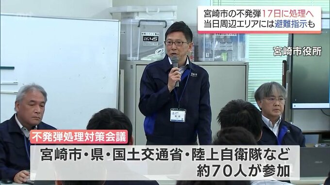 7日は宮崎市役所で会議が開かれ、市や県、それに国土交通省や陸上自衛隊などおよそ70人が参加して協議した結果、不発弾の処理を今月17日の午前11時から行うことを決定しました。