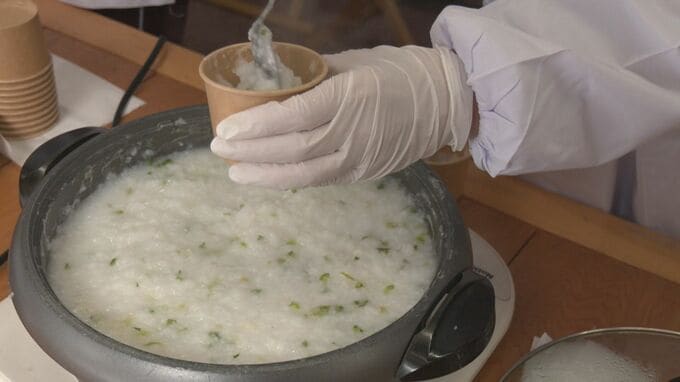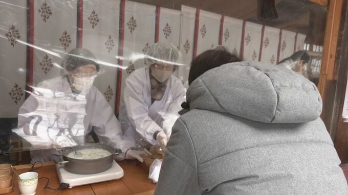 一年の無病息災を祈願し、邪気や万病を払うとされる七草がゆが神前に供えられました。地元でとれた新鮮なセリやナズナなどが入っていて、約200食分が参拝者らに振る舞われました。