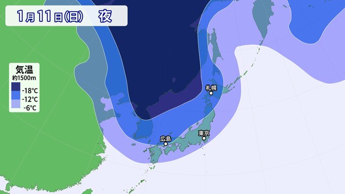 上空1500m付近の寒気の予想を見てみると、11日(日)夜、平地で雪を降らせる目安の-6℃以下の寒気が日本の南岸までかかっています。広島では、さらに強いレベルの-12℃以下の寒気が、県内を覆う見込みです。また、上空のより高い位置の寒気を見ると、北日本には大雪を降らせる目安の非常に強い寒気が入る見通しです。