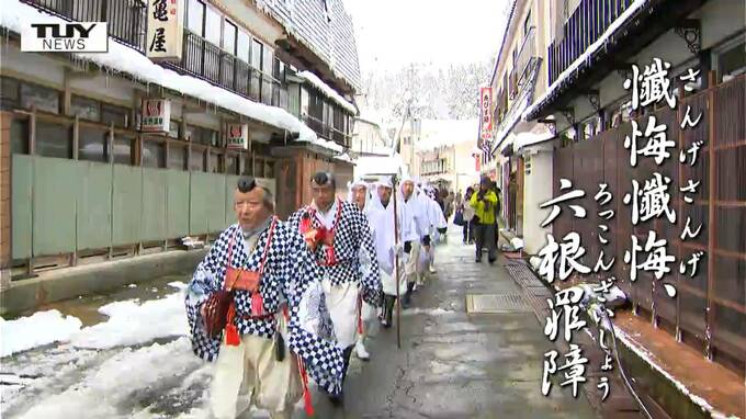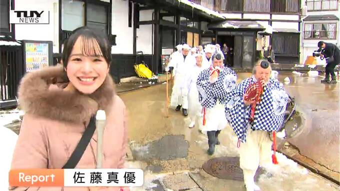 佐藤真優アナウンサー「肘折の冬の風物詩「さんげさんげ」です。白装束に身を包んだ地元の方や若者たちが街を練り歩いています」