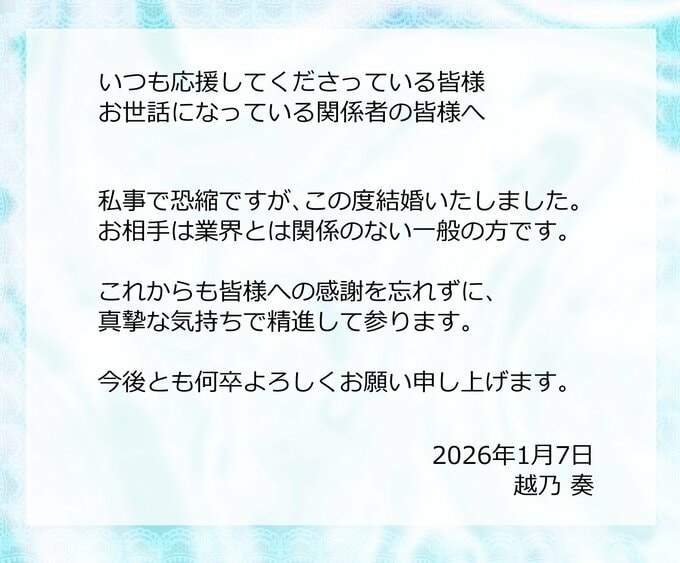 越乃さんは声優として活動しており、今回の結婚発表にあたっては、ファンや関係者に対して「今後とも何卒よろしくお願い申し上げます」とメッセージを送っています。