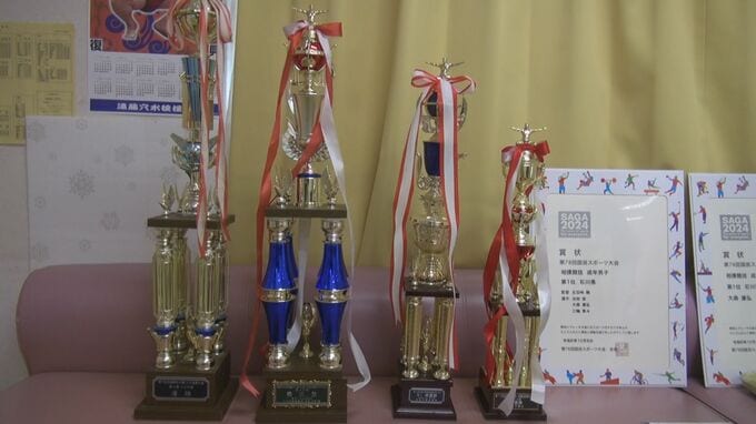 穴水町の実家にはこれまでの実績を物語るトロフィーが並びます。