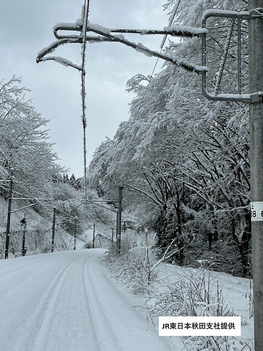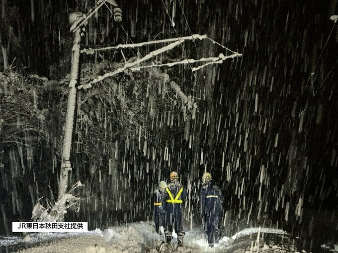 JR東日本秋田支社によりますと、運転見合わせは、秋田県側で大雪による倒木で停電が発生したためで、現在、倒れた木の伐採や除雪作業が行われています。