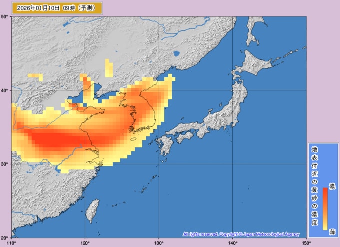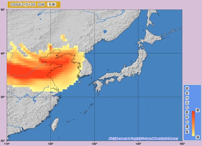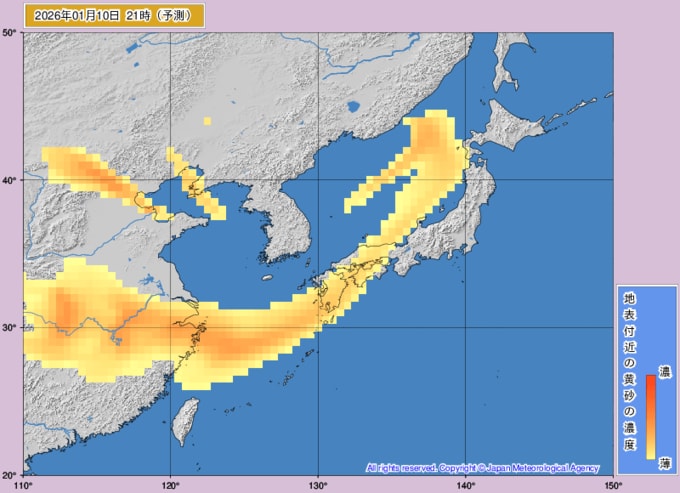 【黄砂情報】10日、11日は日本列島に黄砂飛来か...1月10日~1月11日の黄砂シミュレーション 黄砂を上空から見たデータで確認 気象庁発表 テレビユー山形 2026年1月8日(木) 10:50 国内 ■黄砂はいつどこに?(10日)