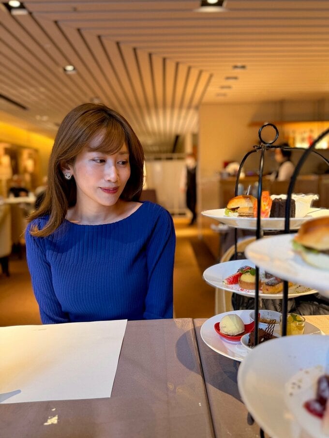 落ち着いた雰囲気の店内で、アフタヌーンティーを楽しむ中川さんの穏やかな表情で微笑む姿から、充実した一日を過ごした様子が伝わってきます。