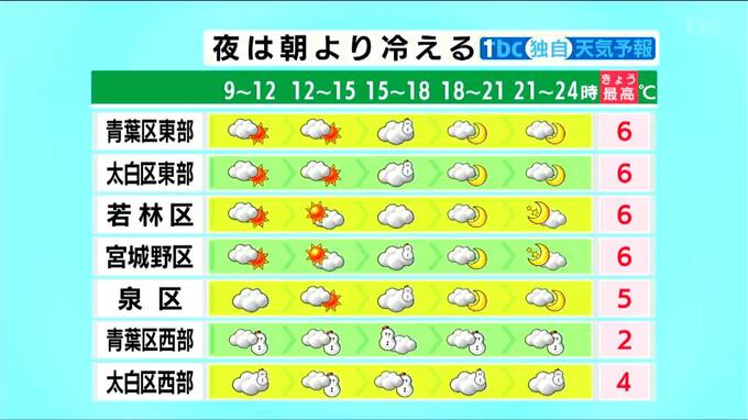 ■青葉区東部:最高気温6℃ ■青葉区西部:最高気温2℃