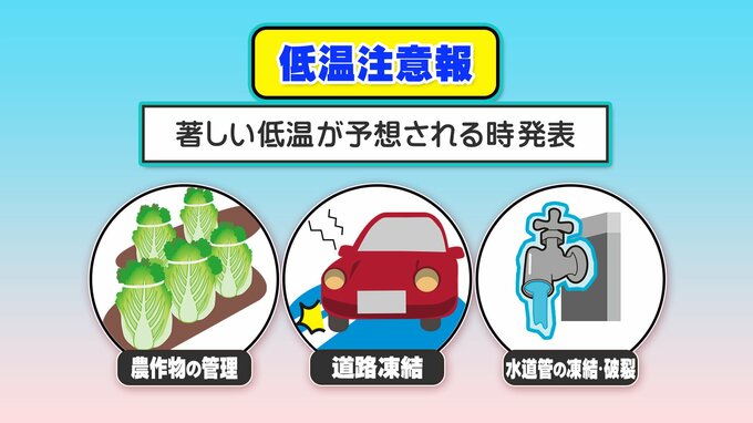 「低温注意報」は、著しく低い気温が予想されるときに発表されます。