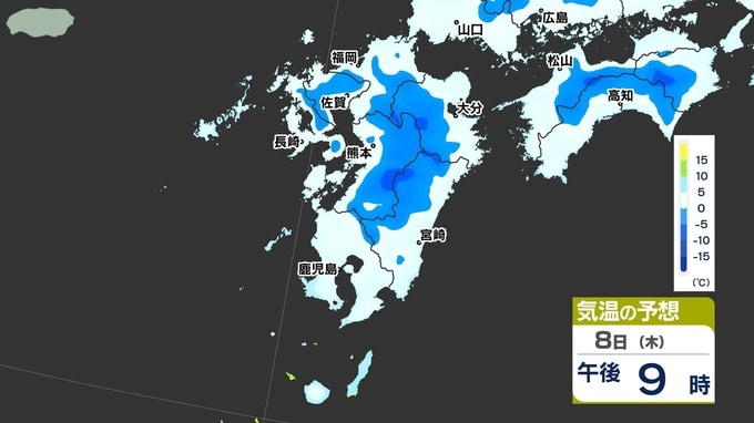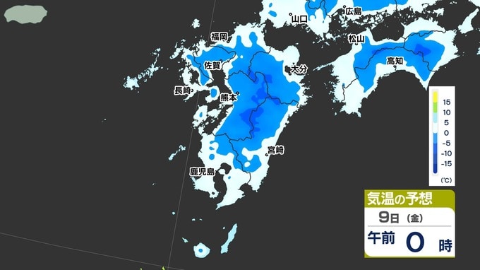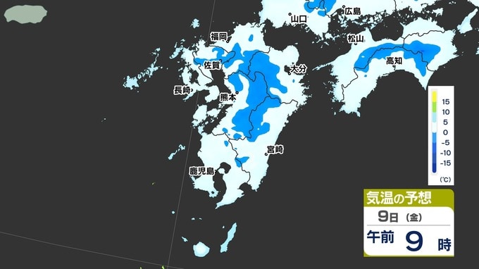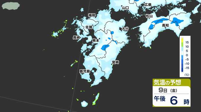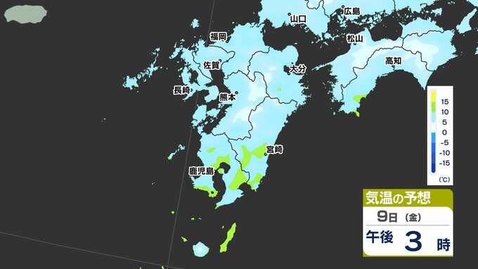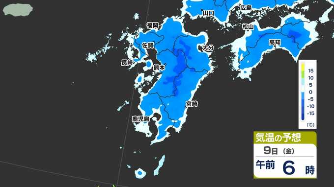 【九州に低温注意報】あす朝「路面凍結」「水道管凍結」に注意【予想最低気温 / 九州各都市の週間予報(3連休は?)】福岡・佐賀・長崎・大分・熊本・宮崎・鹿児島 南日本放送 2026年1月8日(木) 12:10 国内 天気 気温シミュレーション9日(金) 8日(木)午後6時以降の気温シミュレーションです。夜になるといちだんと冷え込んできますので、今夜は暖かくしてお休みください。9日(金)朝は氷点下5℃以下のところが多く予想されています。