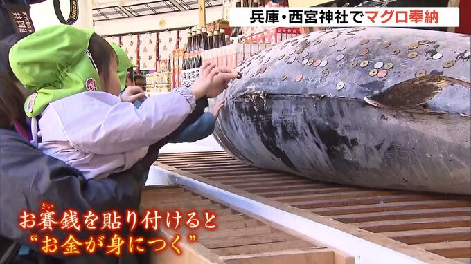 兵庫県の西宮神社では商売繁盛を願う「十日えびす」を前に、特大のマグロが奉納されました。 西宮神社の拝殿に横たわるのは体長約3m、重さ約270kgの千葉県産本マグロ。 1月9日からの十日えびすの間、商…