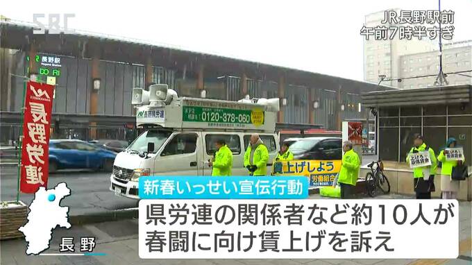 長野駅前で8日朝に行われた宣伝活動には、県労連の関係者などおよそ10人が集まり、春闘に向け、賃上げを訴えました。