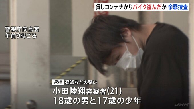 貸しコンテナから原付バイク1台を盗んだとして、21歳の男と10代の2人が警視庁に逮捕されました。窃盗などの疑いで逮捕されたのは、小田陸翔容疑者(21)と18歳の男と17歳の少年です。3人は去年4月、さいたま市岩槻…