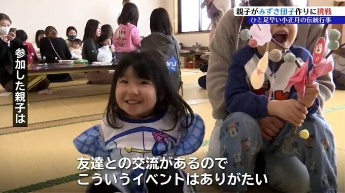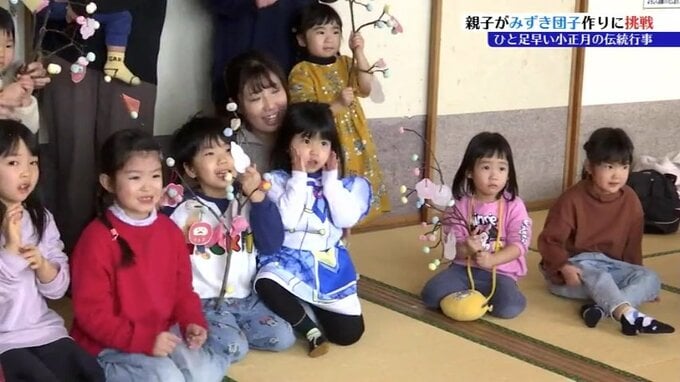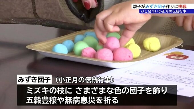 15日の小正月を前に、盛岡市のスーパーで親子が伝統行事のみずき団子作りに挑戦しました。