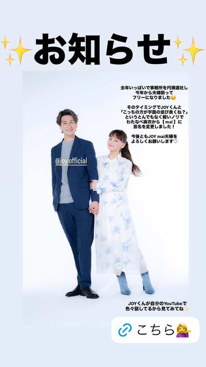 合わせて「そのタイミングでJOYくんと」「『こっちのほうが字面の並び良くね?』というとんでもなく軽いノリで」「わたなべ麻衣から【 mai 】に芸名を変更しました!」と、改名を報告してます。