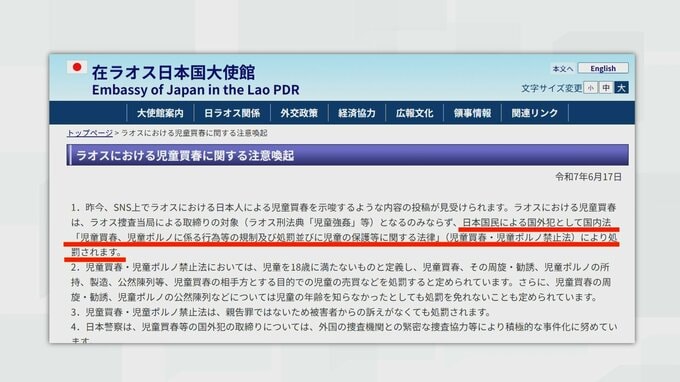 事態を重くみた現地の日本大使館は2025年6月、日本人による児童買春が刑法の国外犯にあたるとして異例の注意喚起を出しました。
