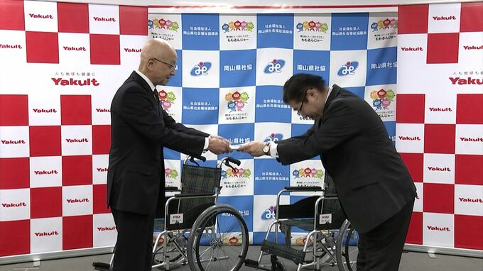 この事業は、岡山県内のヤクルト販売会社3社が社会貢献活動としてチャリティーセールの収益の一部を使い毎年行っているものです。贈られた車いすは今回で2911台になり、介護施設などで役立てられるということです。