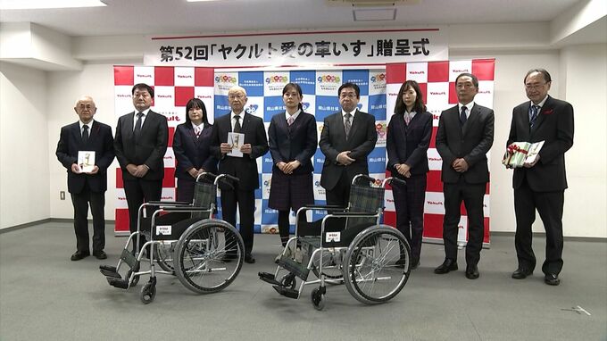 介護施設などで役立ててもらおうと、岡山県内のヤクルト販売会社3社が社会福祉協議会に車いすを贈りました。