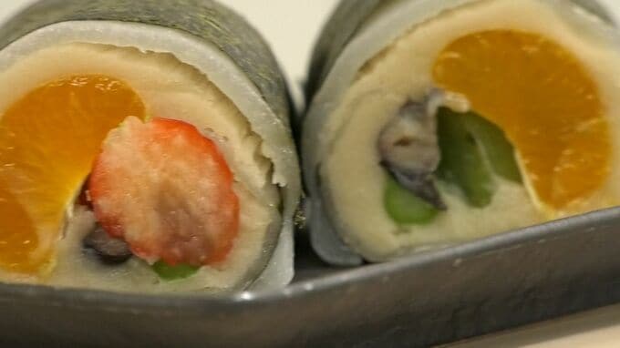 こちらは「恵方ロール」の新作「大福恵方巻」です。白あんにさぬきのフルーツやアスパラガスなどを入れ、餅とのりで巻いています。