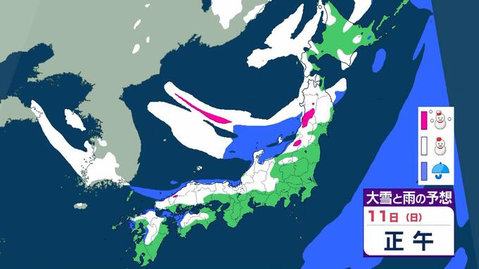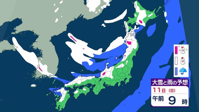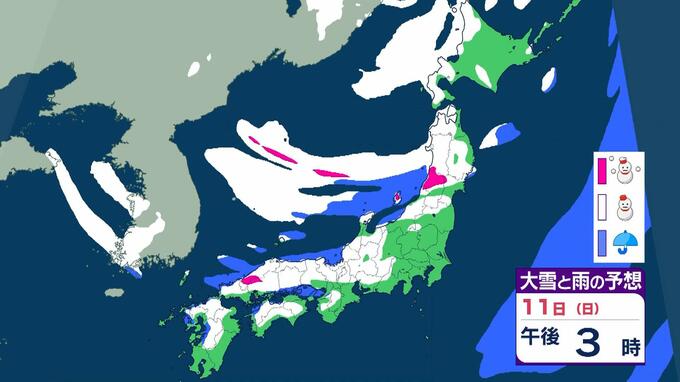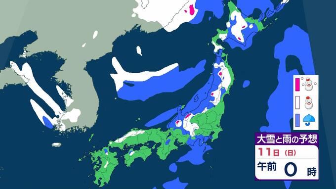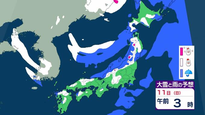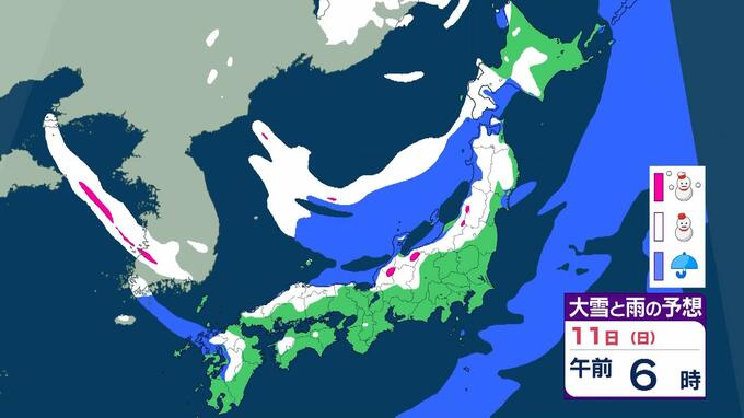 【警報級大雪おそれ】3連休は東北で1メートル、近畿北陸東海で70センチの降雪予想 成人の日は注意を!強い寒気が流れ込む影響で日本海側中心に大荒れか 気象庁 雨と雪のシミュレーション 毎日放送 2026年1月9日(金) 09:52 国内 天気 11日(日)雨と雪のシミュレーションを見る