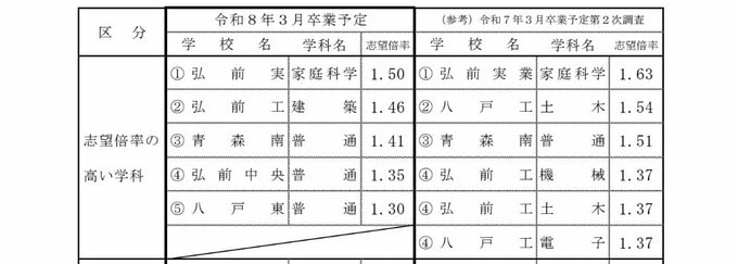 倍率がもっとも高いのは弘前実業高校・家庭科学科の1.50倍で、次いで弘前工業高校・建築科の1.46倍、青森南高校・普通科の1.41倍です。