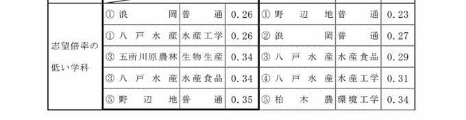 倍率がもっとも低いのは浪岡高校・普通科と八戸水産高校・水産工学科の0.26倍で、次いで五所川原農林高校・生物生産科と八戸水産高校・水産食品科の0.34倍です。